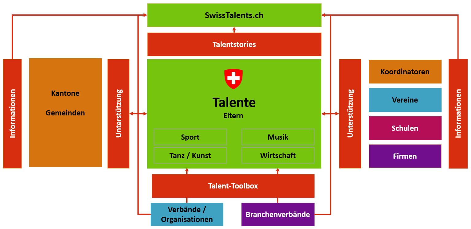 Hier eine Übersicht der Beteiligten von SwissTalents. All dies können wir aber nur mit den Partnern aufbauen. Und da sind wir aktuell in vollen Zügen daran! Wer dabei sein will, einfach melden!